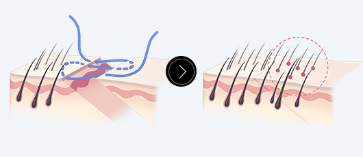 - Incision is made on the hair root at an oblique angle, minimizing damage to the hair roots.The scars become invisible as hair grows after surgery.